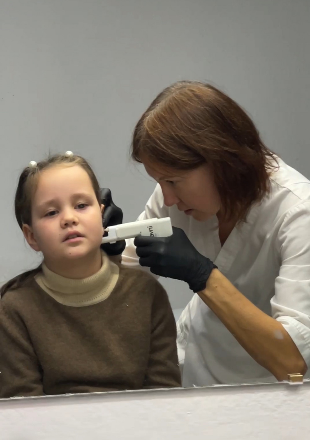 У Наталии профессиональный пистолет для прокалывания ушей, серьги — в индивидуальных стерильных наборах. Она вставляет пистолет с серёжкой в свой большой аппарат, благодаря чему прокол проходит максимально комфортно и практически безболезненно. Наталия очень аккуратно выверила каждую дырочку, учитывая особенности лица ребёнка, чтобы всё выглядело идеально симметрично.